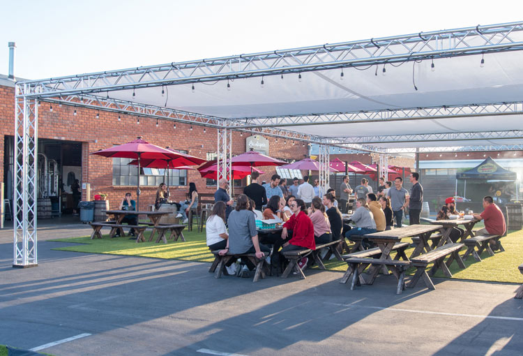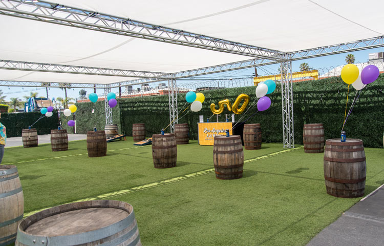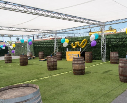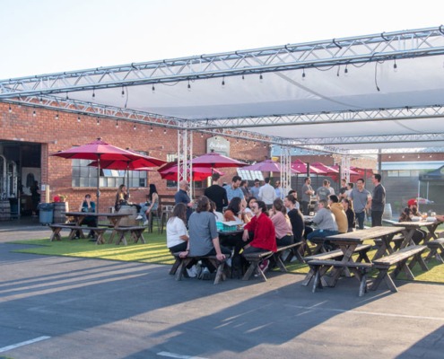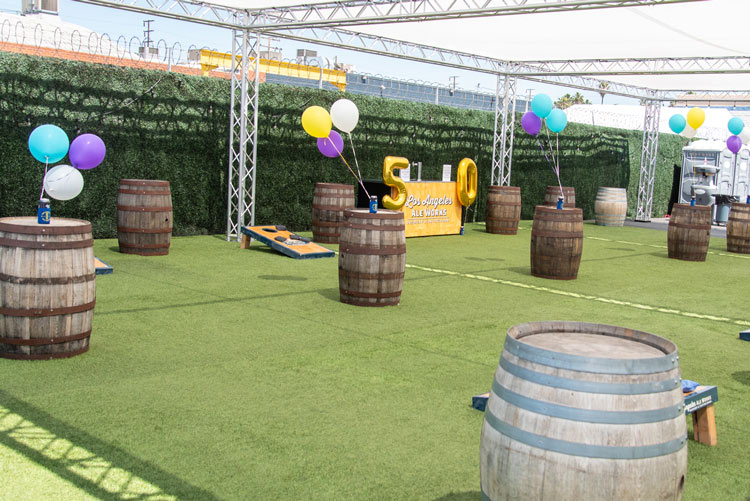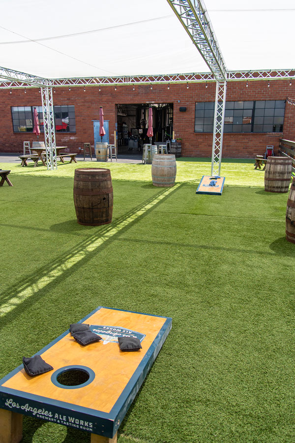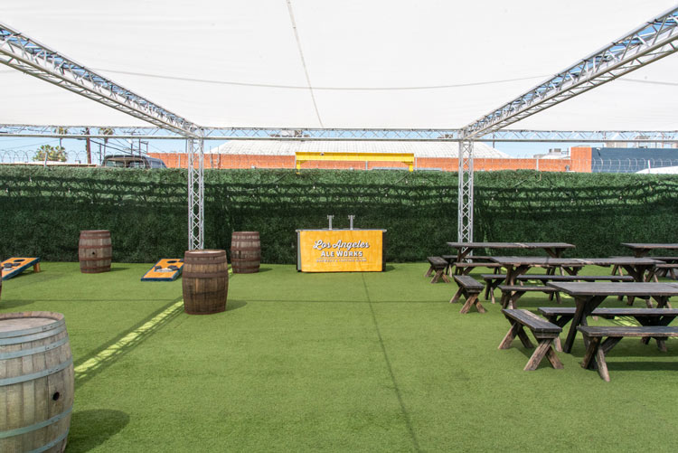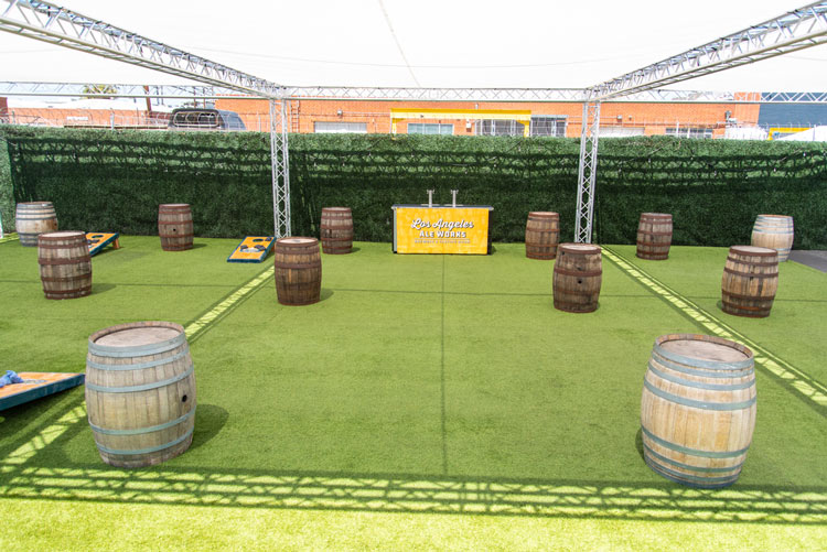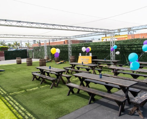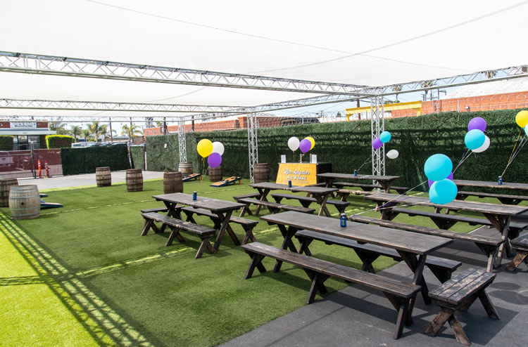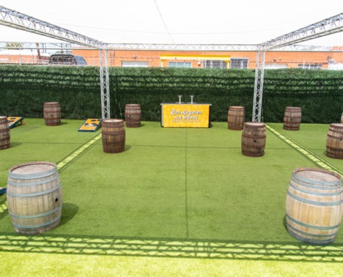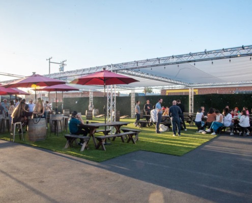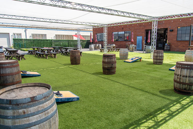 The fully shaded beer garden includes barrel top tables and plenty of standing space. The beer garden is an open air space featuring our signature artificial turf and is surrounded by greenery walls and is fully customizable. This is a great location for large private or corporate events that gives you separation from the main tasting room without needing a full buyout.