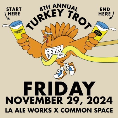 Run, walk, skip or jump – join us for our 0.3km 2nd Annual Turkey Trot from LA Ale Works to Common Space Brewery! First, second and third place winners of the race will be awarded prizes.